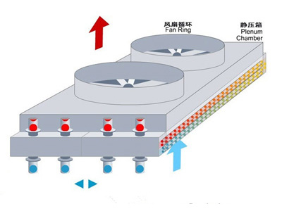 空氣冷卻器簡稱空冷器,以空氣作為冷卻劑,可用作冷卻器,也可用作冷凝器??绽淦髦饕晒苁?、支架和風機組成。空氣冷卻器熱流體在管內流動,空氣在管束外吹過。由于換熱所需的通風量很大,而風壓不高,故多采用軸流式通風機。