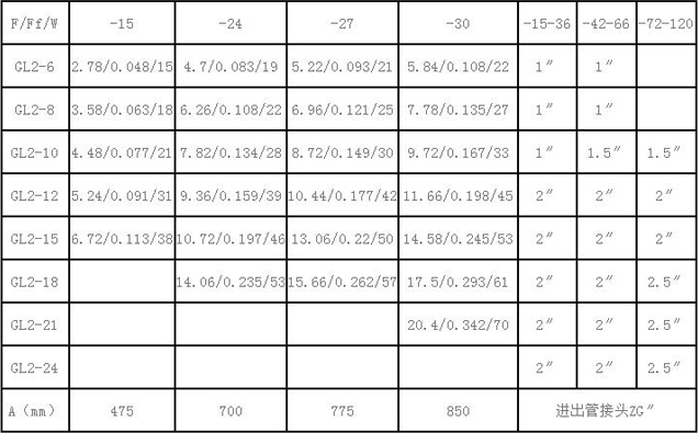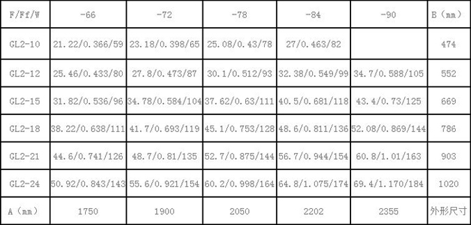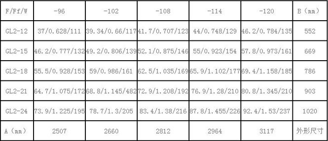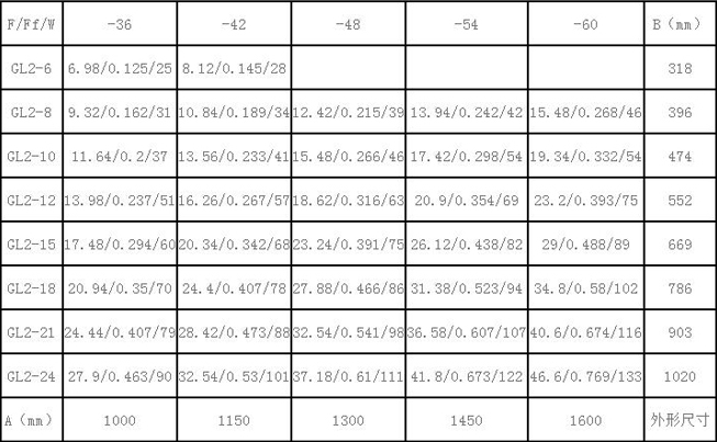 GLⅡ空氣熱交換器散熱面積F(m2)、通風(fēng)凈截面積Ff(m2)、參考重量W(Kg)、安裝尺寸等一覽表